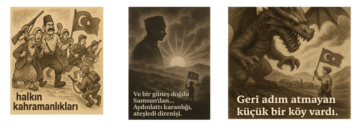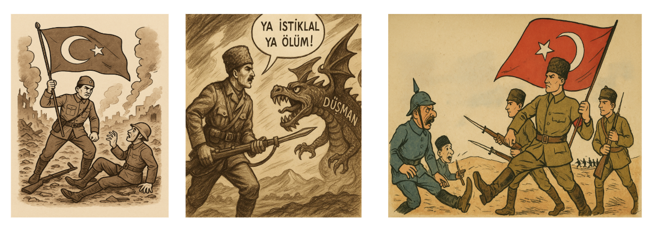 Çalışmamızın bu bölümünde yapay zeka tarafından çizilmiş Kurtuluş Savaşı karikatürleri yer almaktadır. Bundan yola çıkarak bize Kurtuluş Savaşı karikatürleri çizmesinin istedik. 'Bize birtakım Kurtuluş Savaşı karikatürü çizip bu görsellerin çeşitli unsur ,amaç, görsel teknik açısından analizini yap.' şeklinde yönelttiğimiz sorunun sonucunda ortaya çıkan karikatürler şu şekildedir: